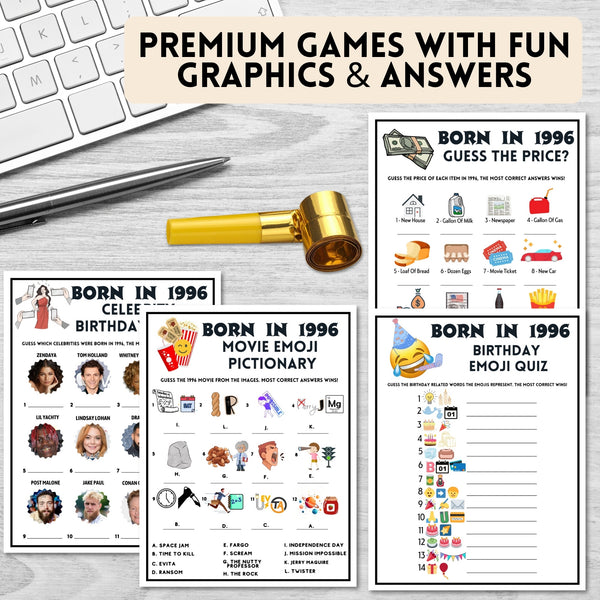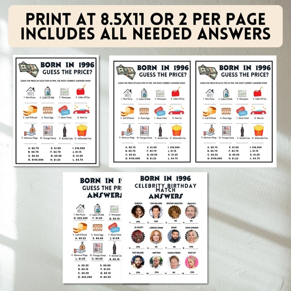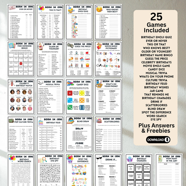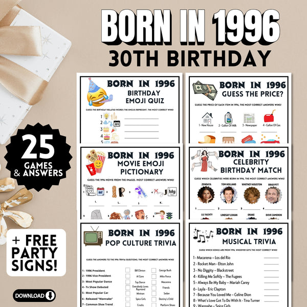 Dirty Thirty just got nostalgic! Rewind to 1996 the year the Spice Girls told us what they really, really wanted, Independence Day blew up the box office, and everyone was hunting for a Tickle Me Elmo. This 1996 30th Birthday Game Bundle is the ultimate throwback experience for your milestone celebration there are 25 games and answers plus matching party signs and a 1996 funs newspaper to hang or frame and gift. Whether you're throwing a bash for a best friend, partner, or sibling, this printable pack is designed to spark memories of the mid-90s. Watch your guests debate whether they owned a Tamagotchi, sing along to "Wannabe," and gasp at how cheap gas was when the birthday VIP was born!