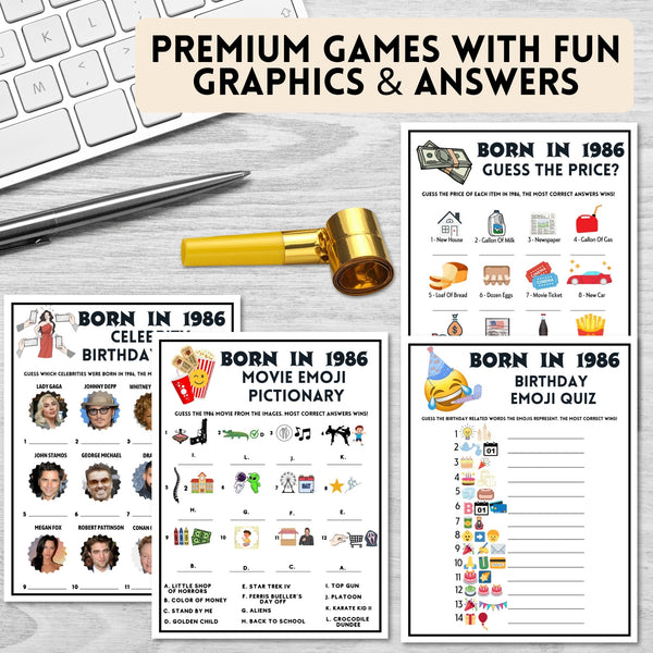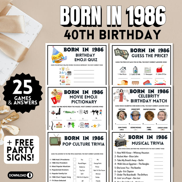 40th Birthday Games Born in 1986 | 25 Printable Adult Party Games | 1986 Trivia & Pop Culture | Men or Women 40th Party Signs