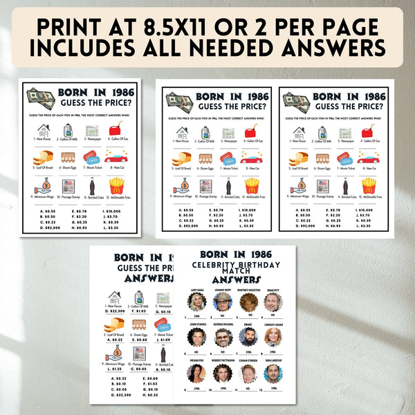 Cheers to 40 years!  Take a radical trip back to 1986 the year of Top Gun, the debut of the Oprah Winfrey Show, and when a gallon of gas was just 89 cents. This 1986 40th Birthday Game Bundle is the ultimate entertainment pack for the big 4-0 celebration including 25 fun games and answers with lots of 1986 trivia plus fun birthday posters to print for party decorations. Whether you are planning a bash for a husband, wife, sibling, or best friend, this printable pack is dripping with 80s nostalgia. It’s the perfect way to get your fellow "80s babies" laughing, reminiscing, and competing to see who knows the birthday VIP (and the year they were born) best!