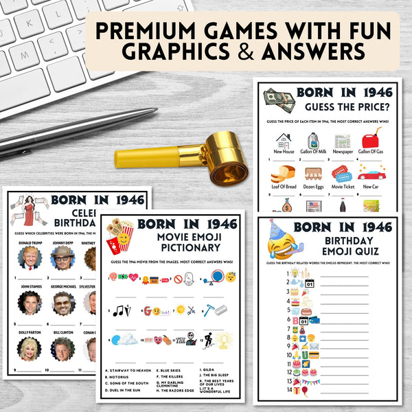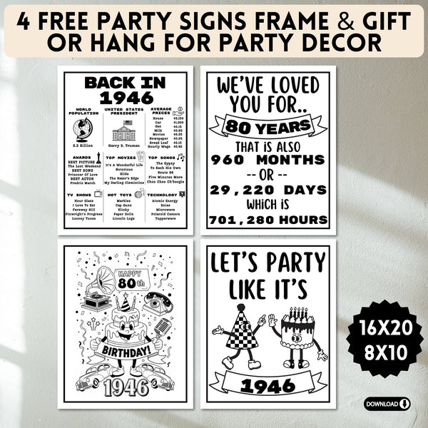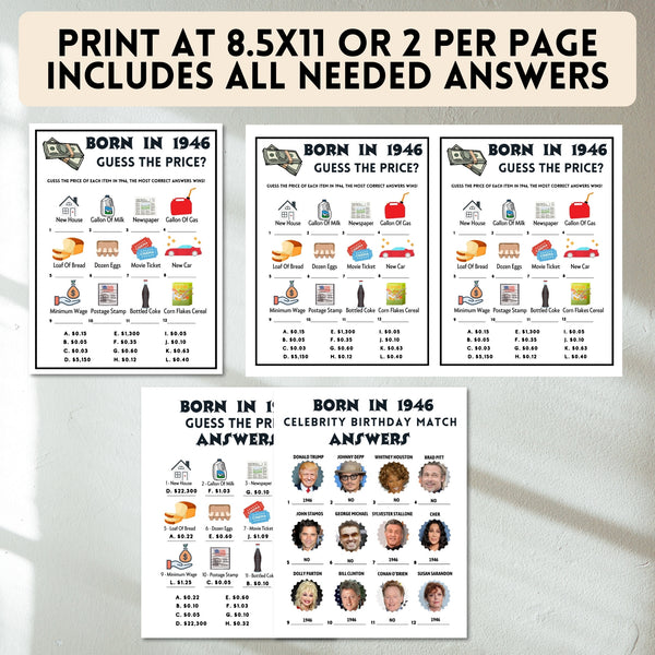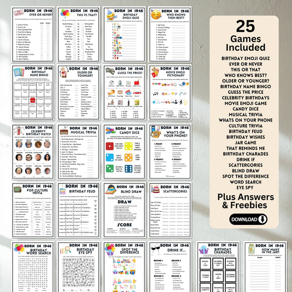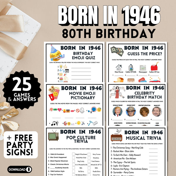 Celebrate 80 incredible years! Take a trip back to 1946 the year the first Baby Boomers arrived, It's a Wonderful Life premiered, and a gallon of gas cost just 15 cents. This 1946 80th Birthday Game Bundle is the ultimate way to honor this massive milestone, with 25 fun games, answers and matching signs games about music, movies, prices everyone will love. Whether you are planning a celebration for Mom, Dad, Grandma, or Grandpa, this printable pack is designed to bridge the generations. It’s a wonderful way to get the whole family laughing, reminiscing about the post-war era, and competing to see who knows the birthday honoree best!