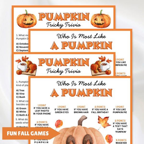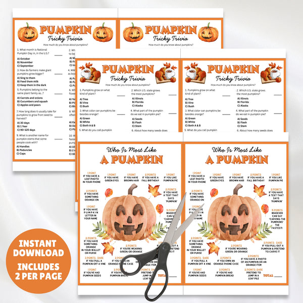 Get ready for some gourd-geous fun with this printable pumpkin game pack! Perfect for any autumn gathering, this set includes 2 challenging multiple-choice trivia games with 20 questions and a silly "How Much Are You Like a Pumpkin?" quiz that's sure to get everyone laughing.